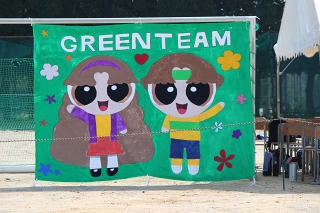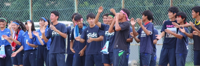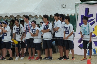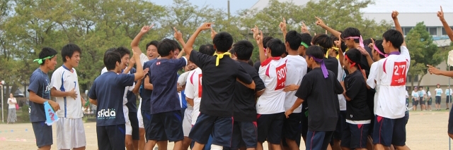 | 部対抗リレーは大いに盛り上がります。 各部が一体となり円陣を組んで気合いをいれます。 |